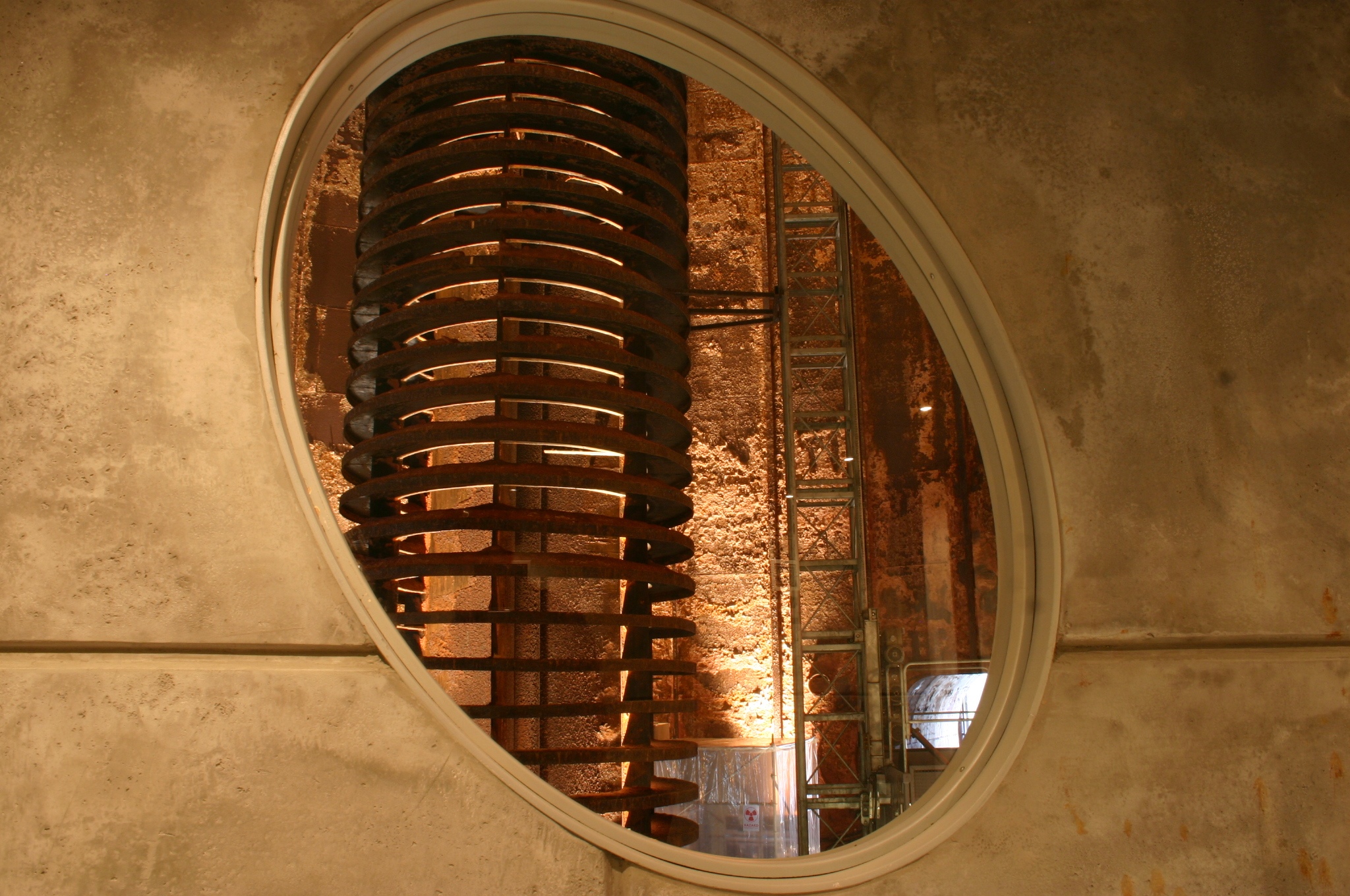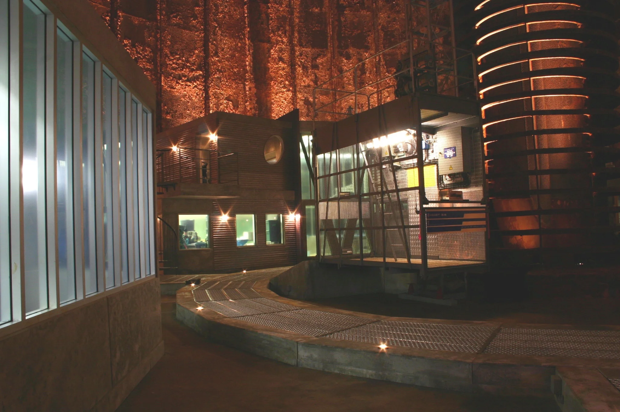 The main lab set was build inside a 90’ high by 60’ wide ,storage silo. The walls of the silo were corrugated and covered with decaying fertilizer type organic material: potage. A set was build within that space. Steel meshed walkways connected individual buildings: Conference Room, Operating Theater, Observation Room, Animal Lab, ER Medical Corridors & Recovery Rooms. In the center of the silo was a core structure holding an elevator and a bridge, which lead to the main above ground entrance. Each set was build with it’s own lighting, fluorescent or incandescent. The main building material was concrete, steel and wood veneer.